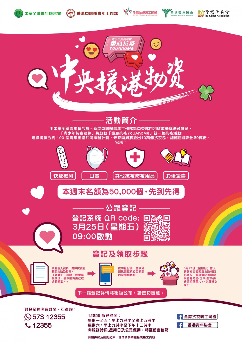 由中華全國青年聯合會、香港中聯辦青年工作部等中央部門和駐港機構牽頭推動,中國紅十字會和各級紅會組織積極動員,中國移動、香港電訊、京東、騰訊、碧桂園、以嶺藥業等多家本港和內地機構慷慨捐助,價值超過1.5億元的中央援港物資近日到港,將由「青少年抗疫連線」面向全港青少年及兒童家庭陸續派發。