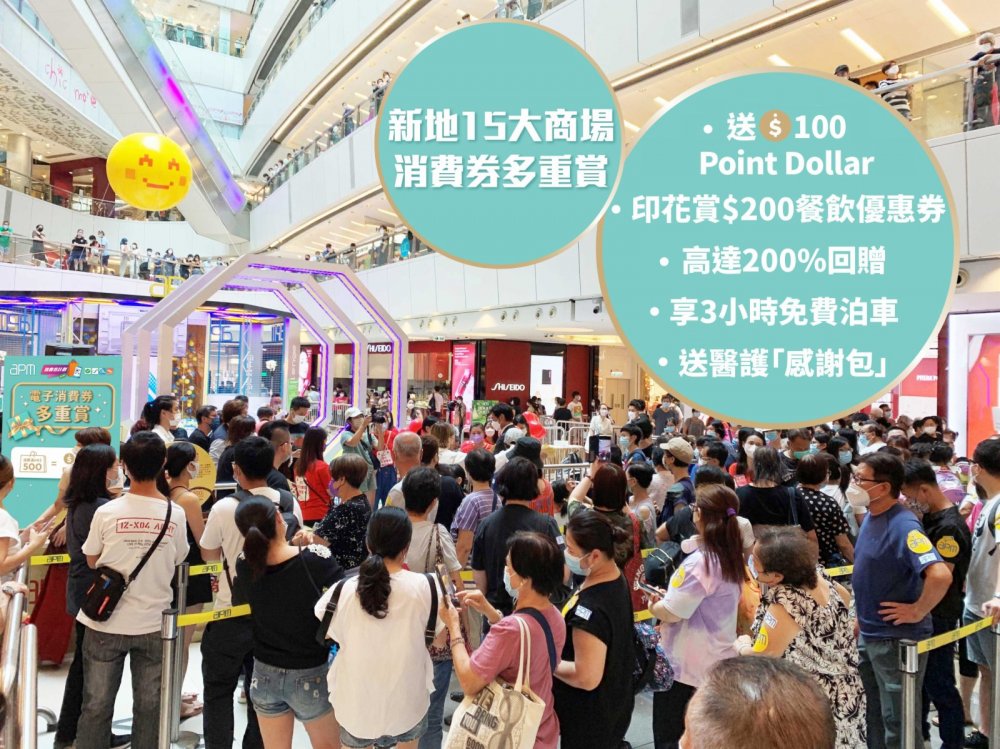 新一輪政府電子消費券計劃將於4月7日向約630萬合資格市民發放首期消費券。為推動全民消費,新鴻基地產旗下15大商場包括apm、大埔超級城、WTC世貿中心、元朗廣場、新翠商場、新都廣場、置富南區廣場等將推出多重消費獎賞,計劃由即日起首階段送出總值超過800萬元獎賞。顧客於首階段計劃之指定電子消費券領取平台,即八達通、支付寶香港、Tap & Go「拍住賞」及WeChat Pay HK參與商場消費,即有機會尊享多重購物獎賞,包括賺$100 Point Dollar、最高消費賞嬴高達200%回贈、消費印花獎賞獲$200美食優惠券、無需消費享3小時免費泊車優惠及推出醫護「感謝包」等。