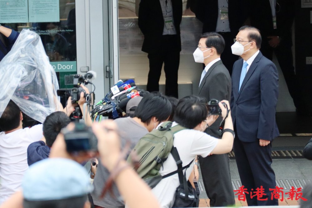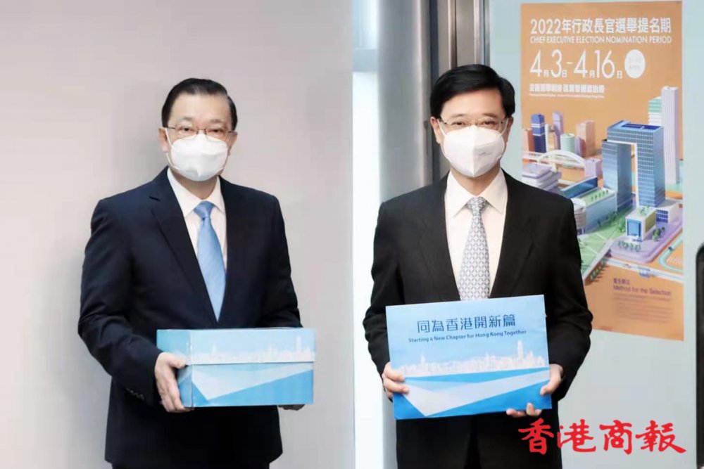 李家超今早(13日)9時20分左右抵達中環愛丁堡廣場的展城館,在其競選辦主任、全國人大常委會委員譚耀宗,選舉代理人陳清霞等人的陪同下,向選舉事務處提交786張選委提名表格,正式報名參加第六屆香港特別行政區行政長官選舉。