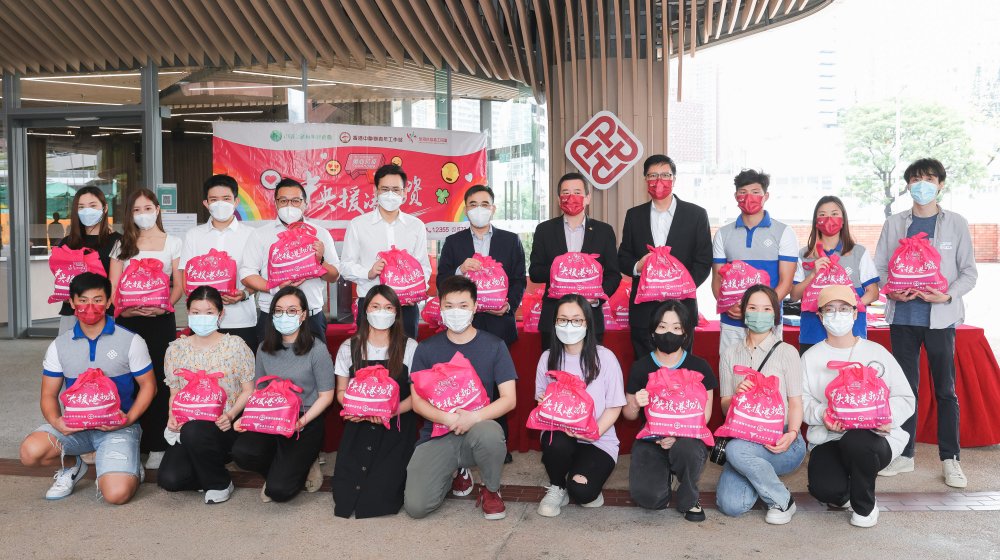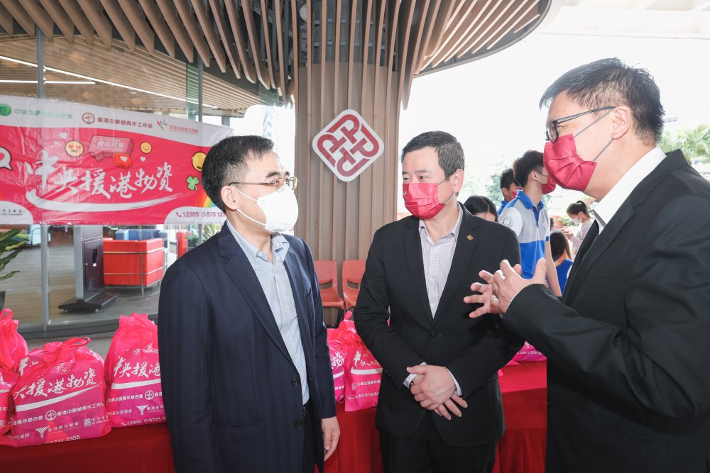 香港中聯辦社團聯絡部部長鍾吉昌,港青年聯會常務副主席楊政龍、副主席何迪夫及蔡曜陽,香港理工大學副校長(學生及環球事務)楊立偉教授,以及理大學務長陳炳泉教授等,在理大校園將中央援港及各界捐贈的抗疫物資,發送到有需要的同學和青年教職員手上。