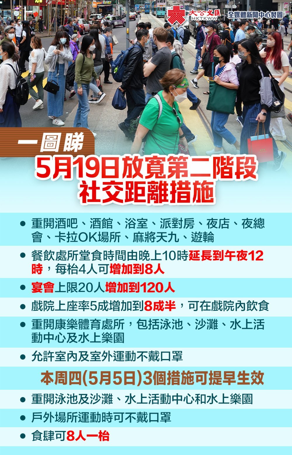本港4月21日起放寬第一階段社交距離措施,林鄭表示,疫情未發生反彈,穩控程度較預期快,每日單日確診數字持續下降,污水監測中的陽性樣本亦下降,有信心繼續在復常之路開步前行。本月19日繼續放寬第二階段社交距離措施,包括延長堂食時間至午夜12時、食肆可8人同桌、重開酒吧、解除室內及室外運動須戴口罩要求等。