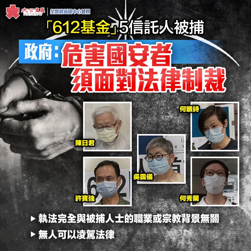 5名「612黑暴基金」的信託人被警務處國家安全處拘捕。香港特區政府發言人今日(12日)表示,執法部門是根據證據、嚴格依照法律,以及按有關人士的違法行為而採取執法行動,完全與被捕人士的職業或宗教背景無關。