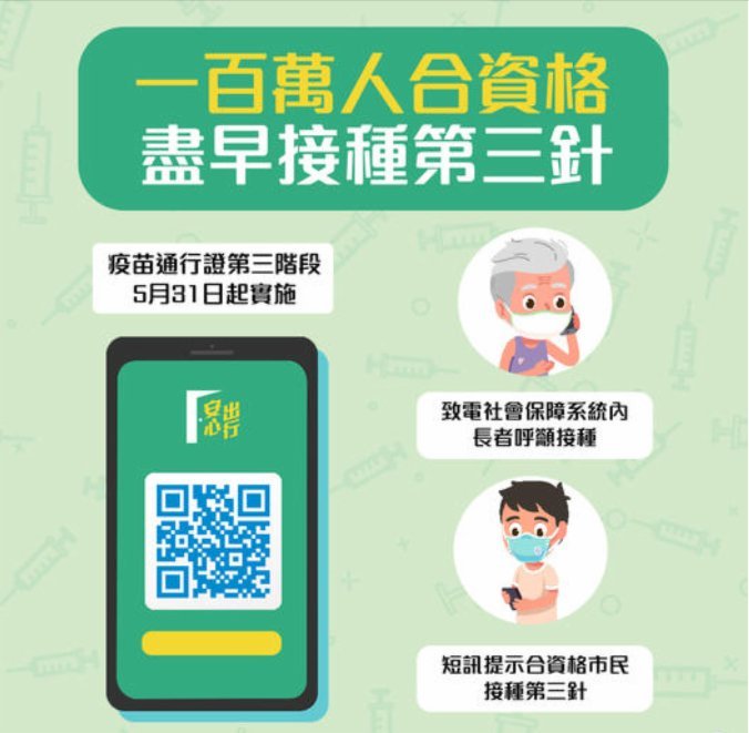 政府5月12日曾表示,目前約100萬人到期而尚未接種第三劑疫苗。因此,新冠疫苗接種計劃在過去兩周向相關人士發出超過100萬條電話短訊提醒相關人士迅速行動,盡早接種第三劑疫苗。此外,「疫苗通行證」5月31日實施第三階段後,所有合資格的市民均須接種第三針方可進入食肆等表列場所。