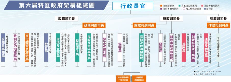 特區政府昨日宣布,行政會議昨日通過重組香港特區政府架構的建議方案,以期於7月1日起實行。方案包括現任行政長官於去年10月發表的2021年施政報告中提出並於今年1月向立法會詳細介紹的多項建議,包括成立新的文化體育及旅遊局;分拆運輸及房屋局為兩個政策局,即運輸及物流局和房屋局;創新及科技局改名為創新科技及工業局;重組民政事務局為民政及青年事務局;擴大環境局並改名為環境及生態局;改組食物及衞生局為醫務衞生局等。這些建議,均獲李家超全盤接納。