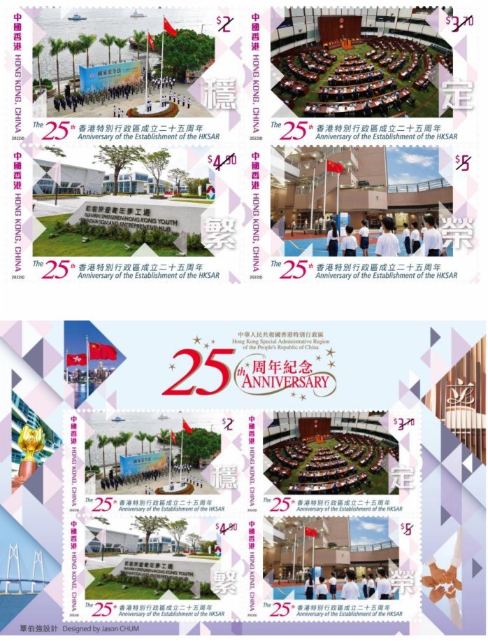 7月份率先發行「香港特別行政區成立25周年」紀念郵票及「中國人民解放軍進駐香港25周年」紀念郵票。2022年為香港特別行政區成立25周年,隨着《香港國安法》及完善選舉制度的落實,「一國兩制」得以行穩致遠。中國人民解放軍駐港部隊自進駐香港以來,一直堅決貫徹「一國兩制」方針和香港特別行政區《基本法》、《中華人民共和國香港特別行政區駐軍法》及《香港國安法》,維護國家主權、安全、發展利益,是維護香港繁榮穩定的重要基石。為紀念香港特別行政區成立25周年及中國人民解放軍進駐香港25周年,香港郵政特別發行紀念郵品展現香港的繁榮發展。