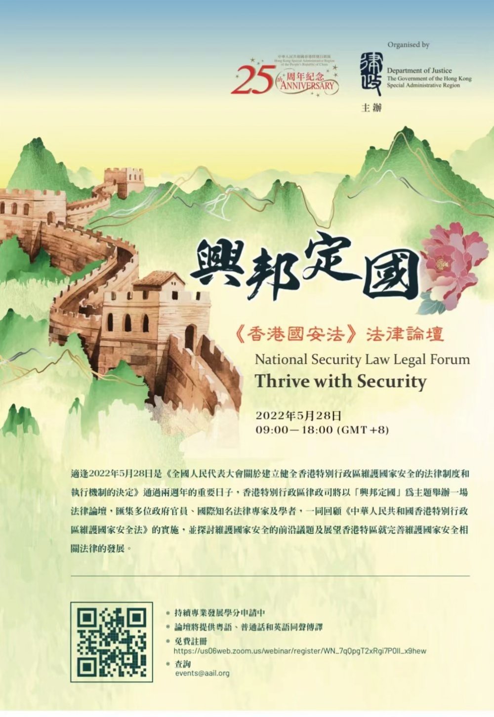 2019年「黑暴」事件,令香港社會秩序大亂,處於動盪不安的局面。此後中央出手,在2020年制定《香港國安法》,堵塞香港的國家安全漏洞,有效止暴制亂,恢復香港社會秩序。本周六(5月28日)是《全國人民代表大會關於建立健全香港特別行政區維護國家安全的法律制度和執行機制的決定》通過2周年的重要日子,律政司將以「興邦定國」為主題舉辦法律論壇,匯集多位政府官員、國際知名法律專家及學者,一同回顧《中華人民共和國香港特別行政區維護國家安全法》(《香港國安法》)的實施,探討維護國家安全的前沿議題及展望香港特區就完善維護國家安全相關法律的發展。