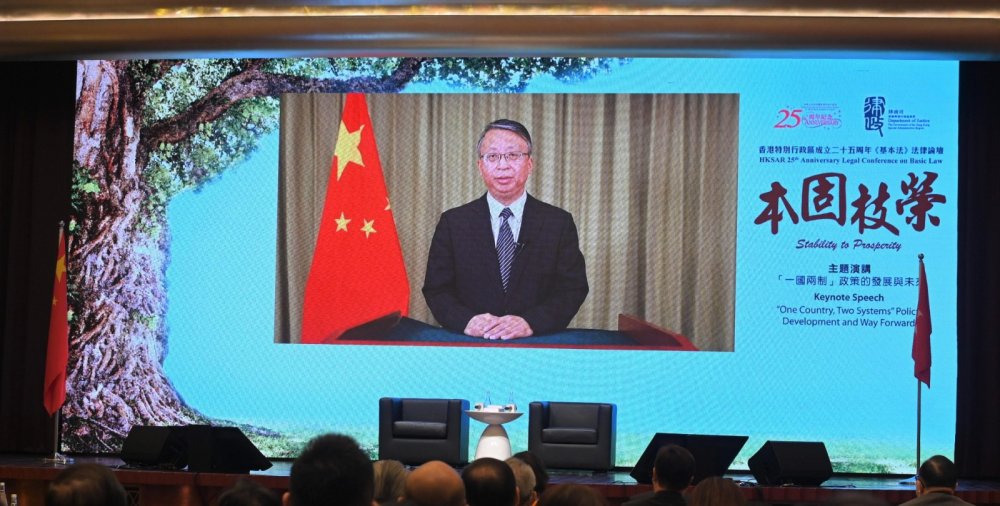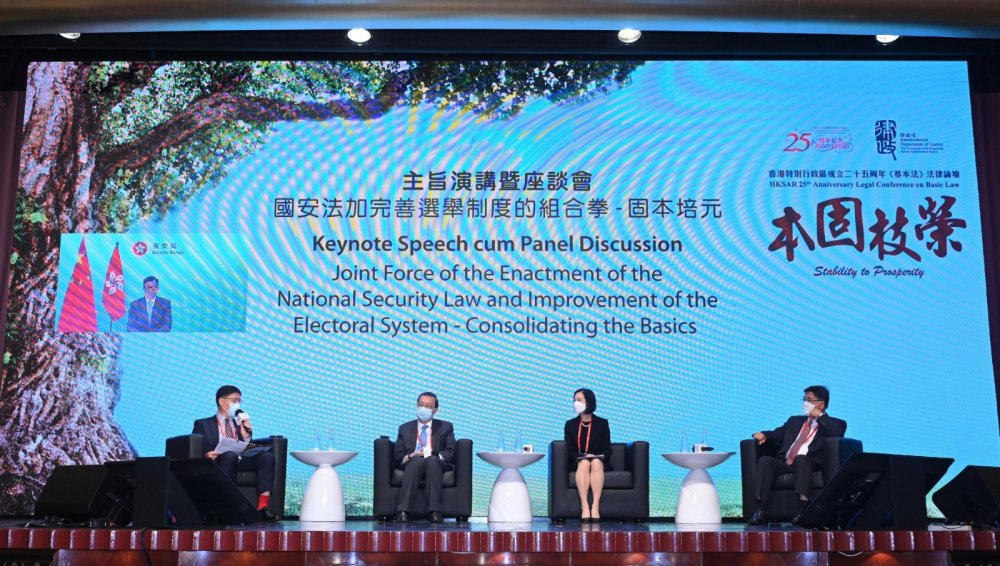 在主題對談環節中,律政司司長鄭若驊和全國人大常委會香港特區基本法委員會副主任譚惠珠暢談《基本法》實踐25周年,指出準確認識「一國兩制」的根本概念,有效維護《憲法》和《基本法》確立的憲制秩序,「本固」才能「枝榮」,香港特區才能由亂到治、由治及興,「一國兩制」行穩致遠,在香港實施的普通法和法律制度也無需要改變。