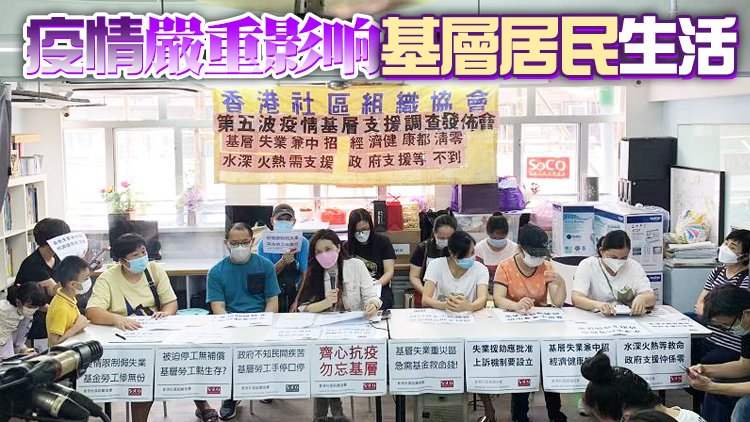 另有近九成人指,因第五波而失業或開工不足或放無薪假,其中失業高達七成。協會指,有逾九成基層家庭已打疫苗,但仍有約六成人確診,而他們失業加確診,求助政府,不論是求檢測、求醫、求隔離、或求食物都得不到政府回應;有逾八成人指僱主不給病假、工資、或失業,沒有僱主可補償,政府的1萬元失業援助亦不批,令基層勞工感到求助無門。