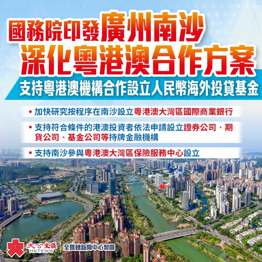 (十六)有序推進金融市場互聯互通。支持符合條件的港澳投資者依法申請設立證券公司、期貨公司、基金公司等持牌金融機構。積極支持南沙參與粵港澳大灣區保險服務中心設立。支持南沙在跨境機動車保險、跨境商業醫療保險等方面先行先試,促進粵港澳三地保險市場融合發展。支持開展移動支付創新應用。加快研究按程序在南沙設立粵港澳大灣區國際商業銀行。支持推進外匯管理改革,探索開展合格境內有限合伙人(QDLP)境外投資等政策試點,支持粵港澳三地機構合作設立人民幣海外投貸基金。加強金融監管合作,提升風險監測、預警、處置能力。
