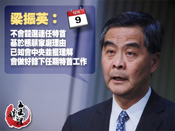 多項利民措施的推出,可見梁振英對維護港人利益方面不遺餘力,惟2016年12月,梁振英基於照顧家庭理由,為免參加選舉造成家人承受不必要的壓力,宣布不會競選連任特首。
