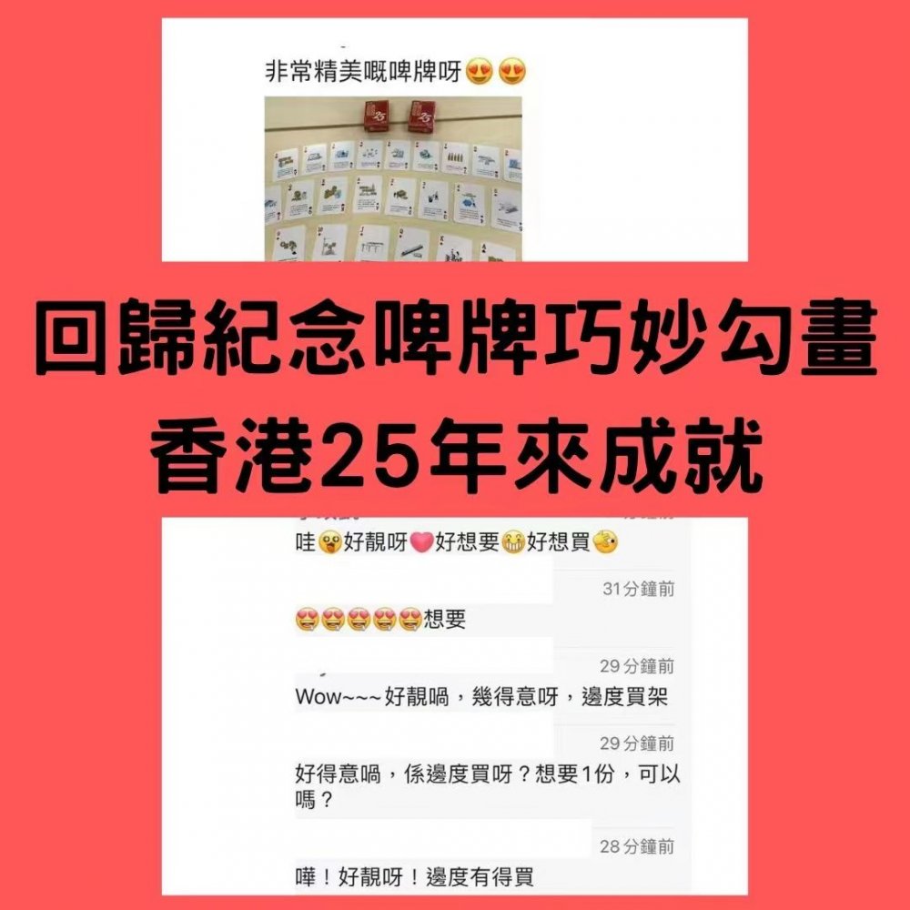 今年是香港回歸祖國25周年,慶祝活動已陸續登場,除了活動外,紀念品也屬必不可少。坊間除了有香港模型、郵票、特刊、文具、卡片座等回歸紀念品外,亦有人別出心裁推出紀念啤牌,由於製作精美,吸引一眾網友眼球,紛紛說「好想要」。