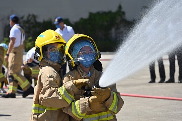 70名消防及救護青年團團員近日參與體驗日,輪流穿上重達3.9公斤的滅火防護服、戴上頭盔,握緊滅火喉,模擬消防員於火場灌救。消防及救護青年團副團長翁錦雄表示,希望青年團能助年輕人鞏固學習經歷,並達致職業導向效果。