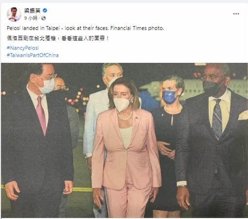 梁振英發文指出,佩洛西一面聲稱其不違背中美聯合公報,一面竄訪,「分裂舌頭,真羞恥她」。此後,他又先後轉發了新華社關於解放軍軍事演訓及發言人談話的消息。