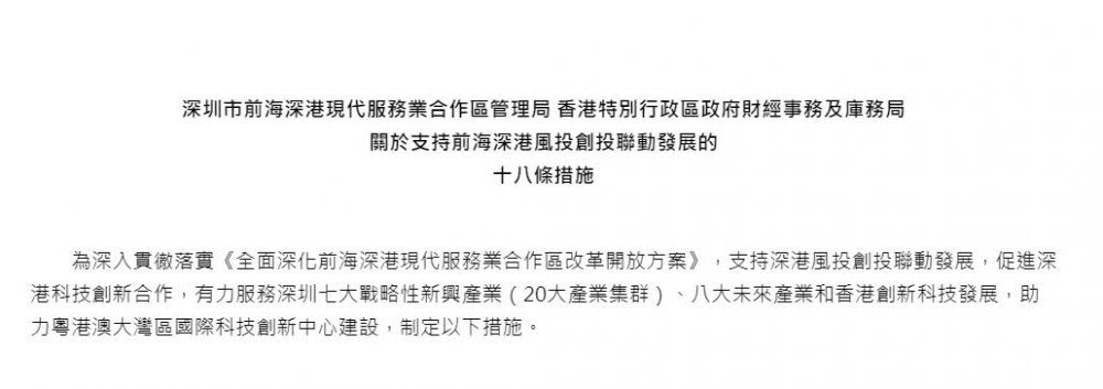 為支持深港在風險及創業投資領域聯動發展,促進兩地科技創新合作,以金融助力粵港澳大灣區國際科技創新中心建設,香港特區政府財經事務及庫務局與深圳市前海深港現代服務業合作區管理局(前海管理局)今日(2日)聯合發布《關於支持前海深港風投創投聯動發展的十八條措施》。