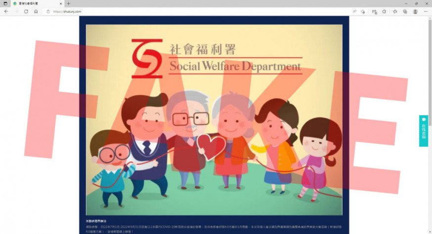 社會福利署今日呼籲市民提防一則聲稱由社署發出的虛假短訊。社署接獲市民查詢,指收到一則聲稱由該署發出的短訊,內容有關「提領防疫補助津貼」。短訊載列網址(https://shukunj.com/),可連結至偽冒的社署網站。