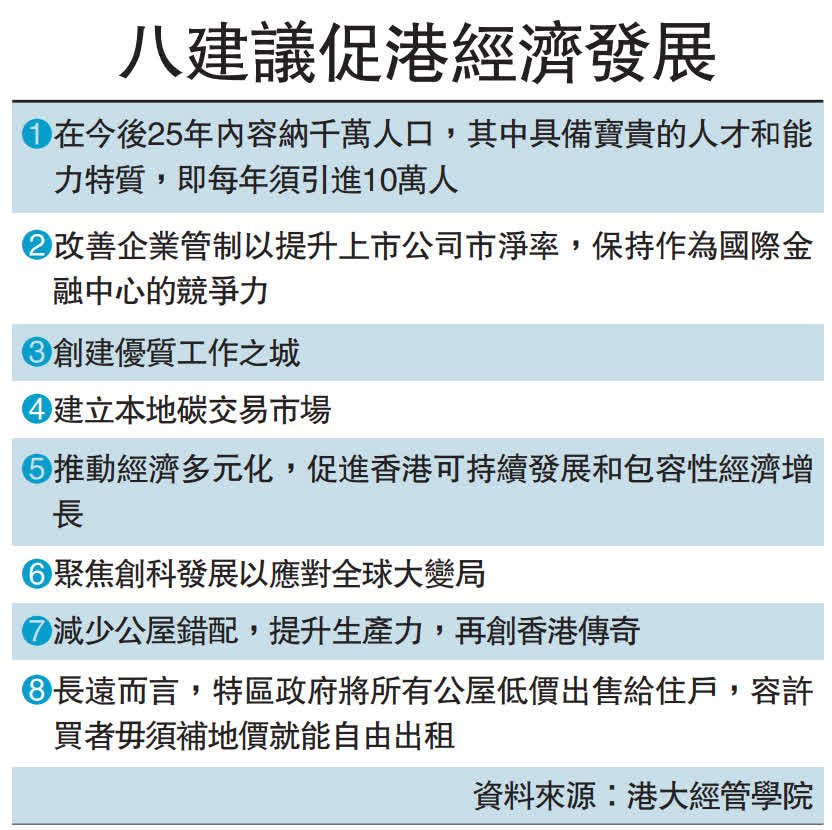 他說,香港必須銳意構思一個大都會願景,要在今後25年容納千萬人口,其中具備寶貴的人才和能力特質。為了實現願景,香港應設法網羅人才,期望在25年內達至千萬人口,亦即每年須引進10萬人。