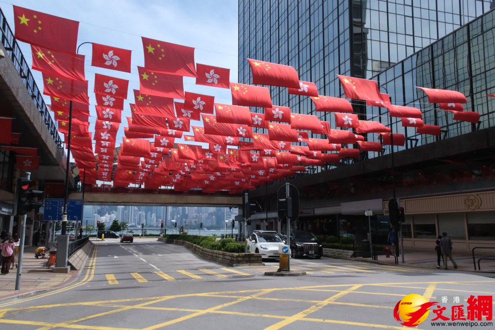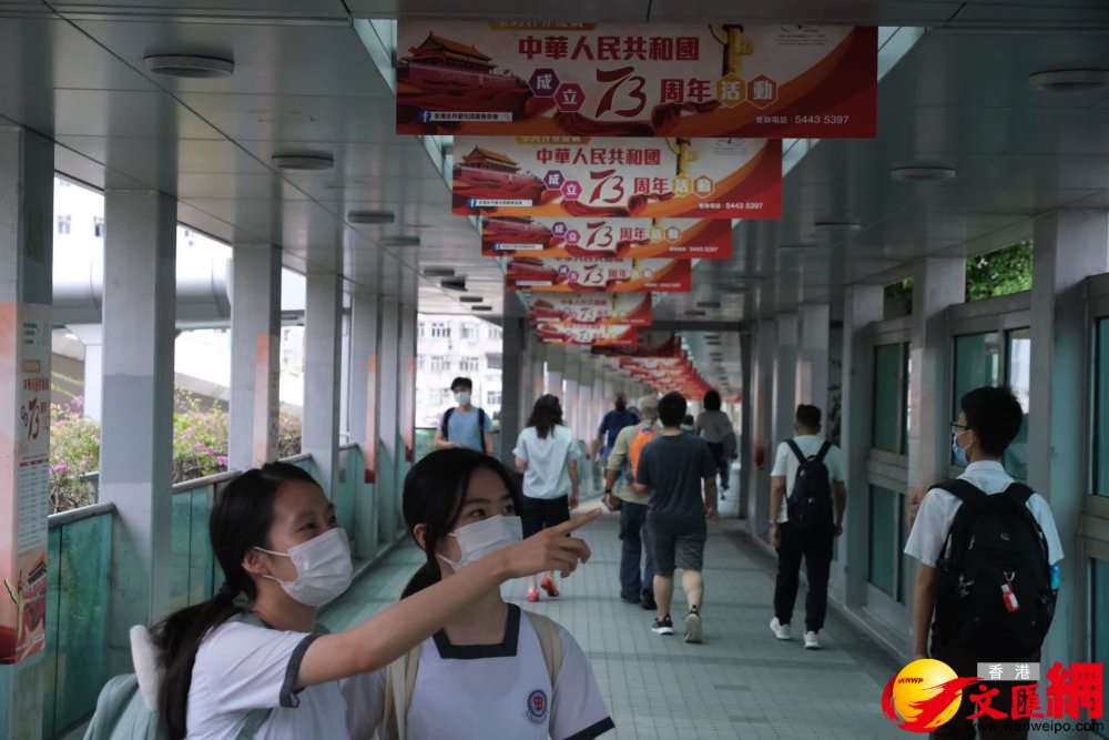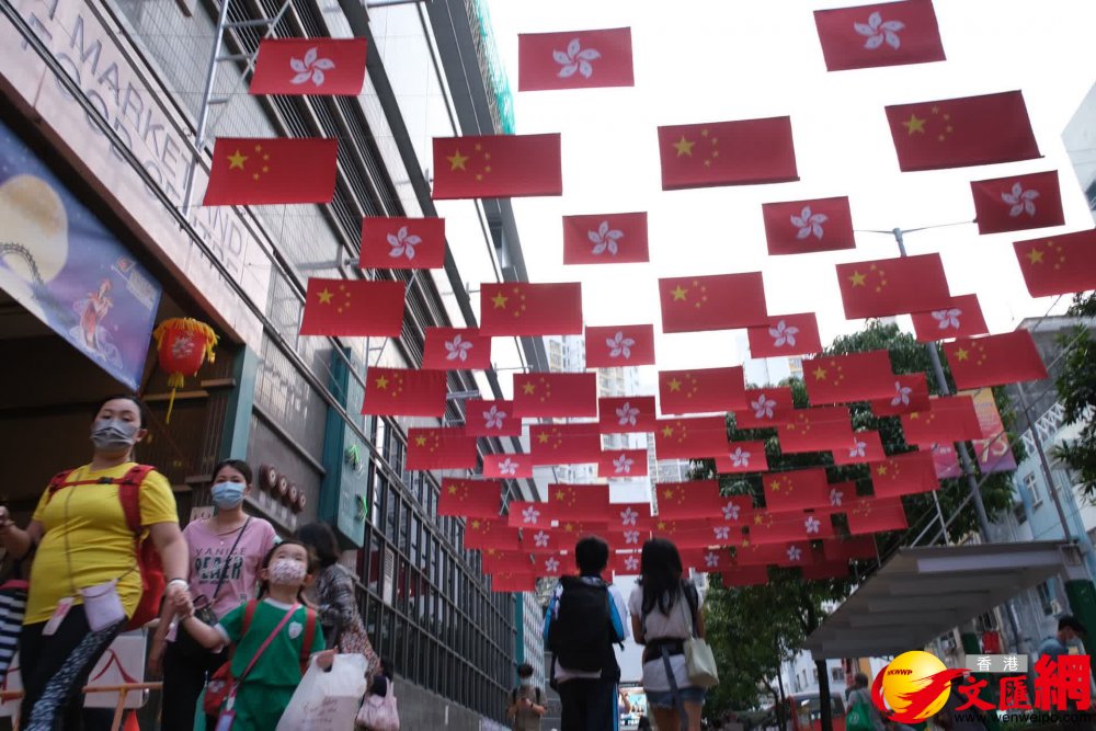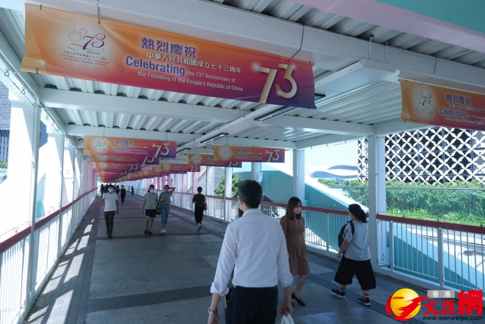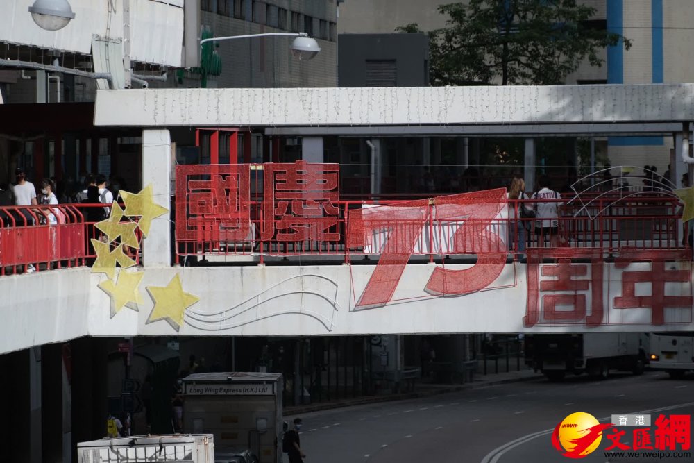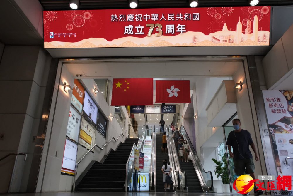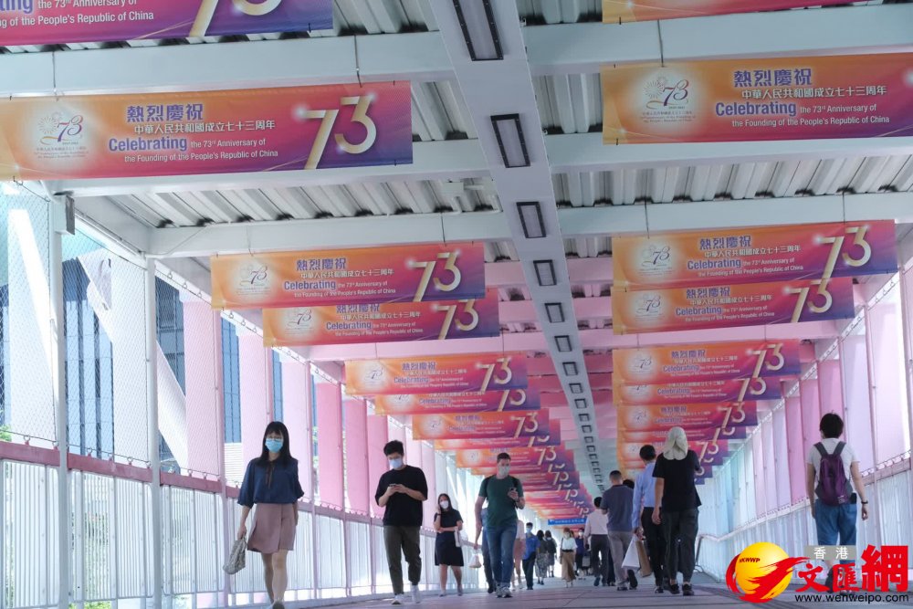 今年10月1日(星期六)是中華人民共和國成立73周年的國慶日,香港的大街小巷悄然披上「中國紅」,五星紅旗和紫荊花區旗交相輝映,歡樂祥和的節日氣氛盡在其中。記者今日(27日)在尖沙咀、荔枝角、荃灣等多地見到,街頭已懸掛起國旗和區旗以及祝福標語,寫着「熱烈慶祝中華人民共和國成立73周年」的巨幅廣告隨處可見,多座金融大廈及政府建築物、行人天橋、街道燈柱、港鐵站出入口等有關慶祝國慶的標語十分亮眼。