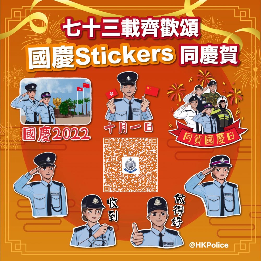 警方為慶祝中華人民共和國成立七十三周年,特別製作了一套「國慶WhatsApp Stickers」送給市民,又祝大家國慶快樂。