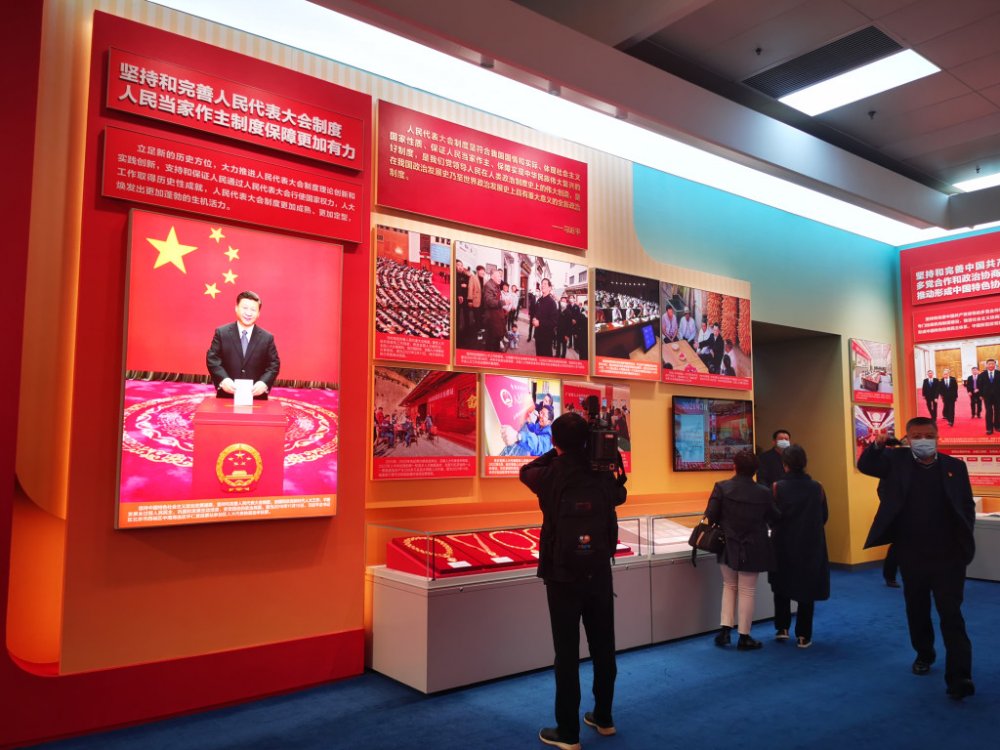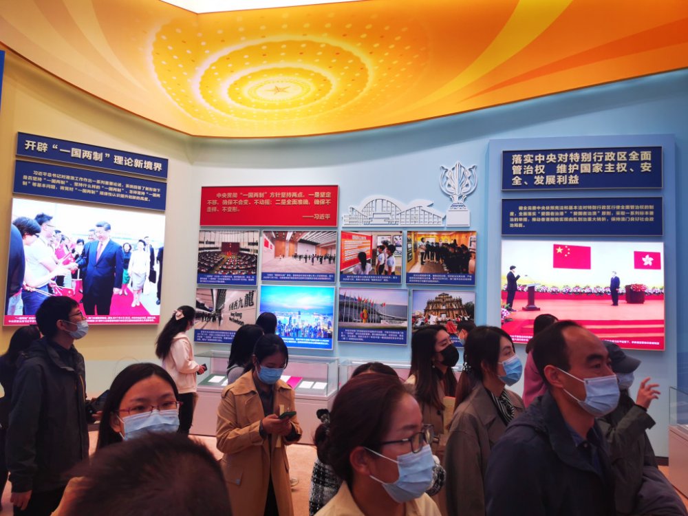 早上九點,展館已經聚集大批來自多個黨政軍體制內單位的參觀者。香港展區著重體現堅定維護國家安全,增強國家意識和愛國精神。開篇即介紹,建立健全香港特別行政區維護國家安全的法律制度和執行機制,完善香港選舉制度,全面落實「愛國者治港」原則,廣泛開展憲法,基本法和國情教育,為確保香港「一國兩制」實踐行穩致遠提供根本保障。