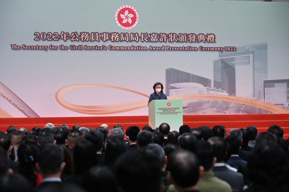 她續說:「勤奮盡責的公務員團隊對維持政府良政善治及香港繁榮安定發揮着重大作用。根據『愛國者治港』原則,公務員須具備維護國家主權、安全和發展利益的意識,並且盡忠職守,以民為本,注重團隊協作精神,敢於擔當。在未來的日子,我深信公務員隊伍定會繼續團結一致,全力協助政府施政,展現『一國兩制』的優勢,同為香港譜寫璀燦新篇章。」