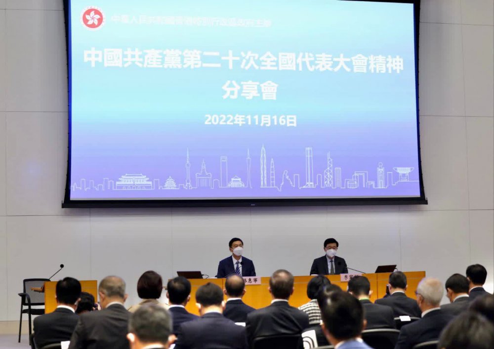 特區政府今日(16日)在政府總部舉辦中共二十大精神分享會,讓與會者進一步深入了解二十大精神。分享會由行政長官李家超主持,中央人民政府駐香港特別行政區聯絡辦公室主任駱惠寧應邀出席,並作分享發言。