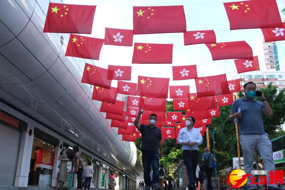 「七一」前後,香港大街小巷處處是耀眼的「中國紅」。在九龍觀塘的坪石邨,20多層高的公屋大廈天井,每一層的三面走廊都掛滿五星紅旗與紫荊花區旗;在香港島,許多大樓外牆張掛着巨幅宣傳畫或慶祝海報,戶外大屏幕滾動播放慶祝短片,巴士車身繪製着慶祝標語;新界鄉民則在街頭豎起各式各樣的慶祝花牌,數量遠超往年。