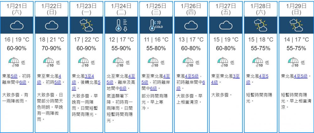 天文台今日(20日)表示,受一股偏東氣流影響,除夕(21日)及農曆年初一(22日)華南沿岸雲量增多。而另一股東北季候風會在年初二(23日)稍後抵達廣東沿岸,該區氣溫再度下降,風勢較大。