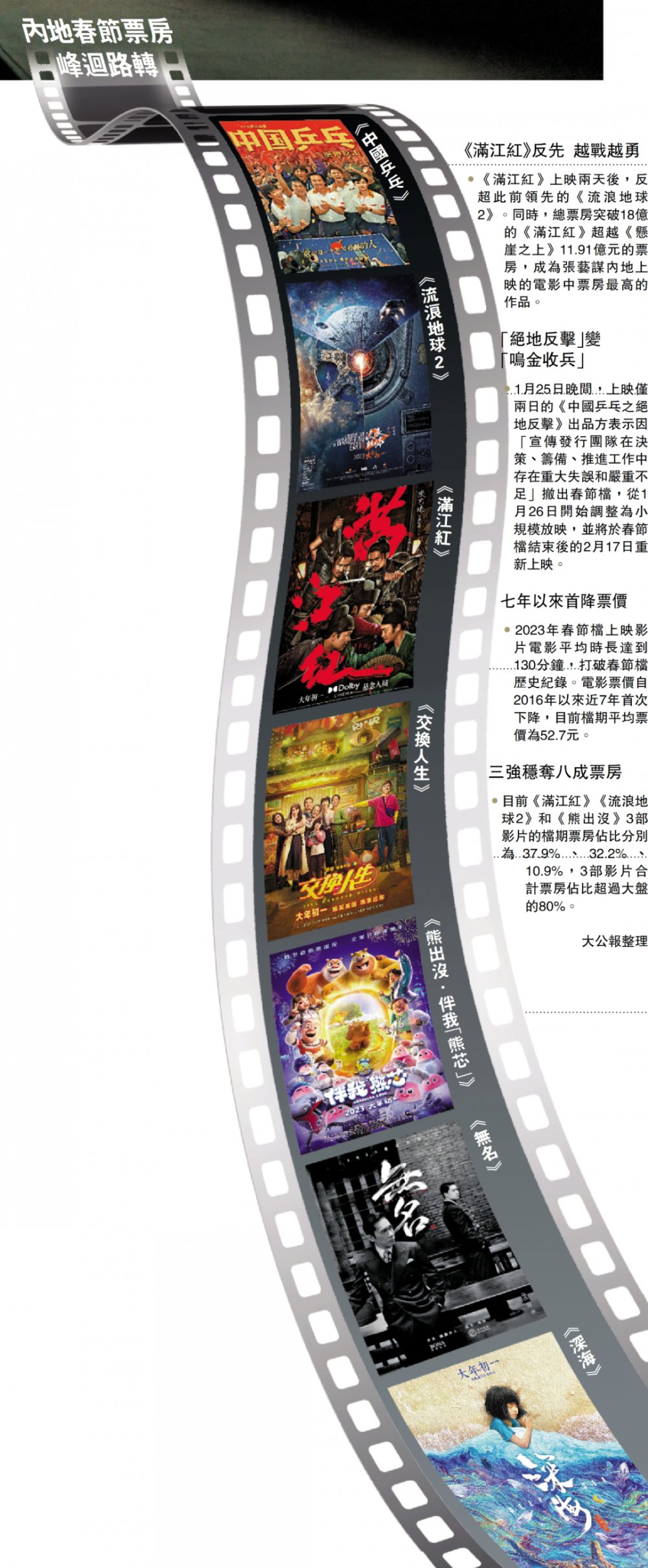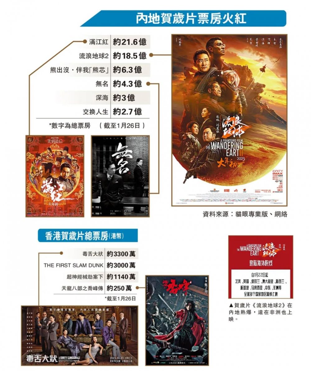 新春期間入戲院欣賞賀歲片,曾經是港人除拜年以外的必然活動,一套套經典賀歲港產片,更成為港人的集體記憶。不過今個農曆新年,可供選擇的港產片很少。反觀內地,多套賀歲片《流浪地球2》、《滿江紅》、《熊出沒·伴我「熊芯」》大獲好評,總電影票房已突破60億元,最賣座的科幻特技片《流浪地球2》更已賣埠到世界各地,甚至遠至非洲,唯獨香港至今仍未能上映,令戲迷大感失望。