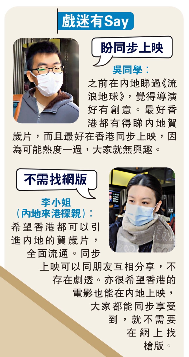 是次《流浪地球2》的香港發行方為英皇電影,2021年同樣由英皇電影在港發行的內地電影《長津湖》以逾二千萬的票房成為近年香港最賣座的國產片。不過,《長津湖》在港上映的檔期,比內地遲了兩個月!對於為何國產片未能在香港同步上映,英皇方面未有正面回應,他們只是透露是次《流浪地球2》預計會於二月在港澳地區上映,同時提到自己當前正跟《滿江紅》、《無名》兩部電影片主積極磋商,希望能盡快將兩部精彩電影帶給港澳觀眾。