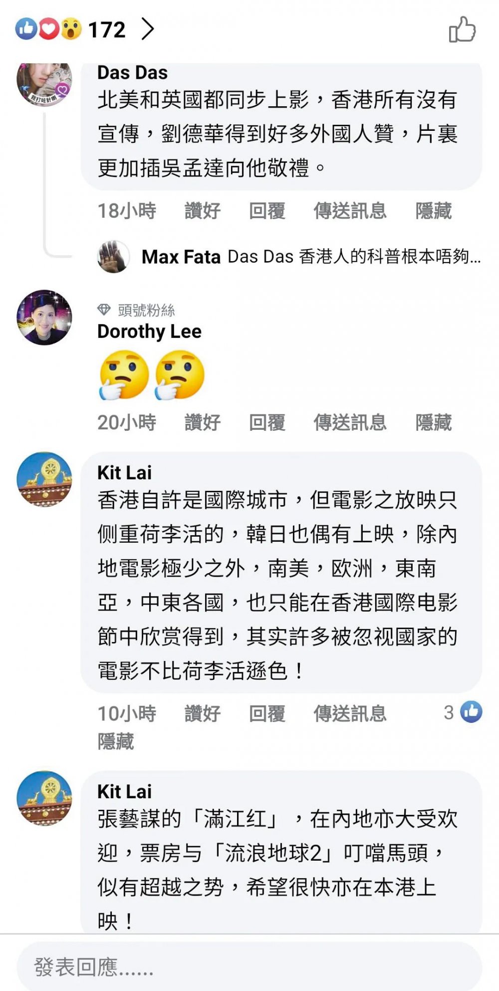 大公報fb粉絲紛紛留言,與電影業界分析不約而同,認為內地電影在港上映的院線少,是受制於在商言商,保護主義等,希望自許國際城市的香港,電影院線能百花齊放,不再長期被荷里活片佔據院線。很多粉絲表達心聲:「香港上,一定入戲院睇」。