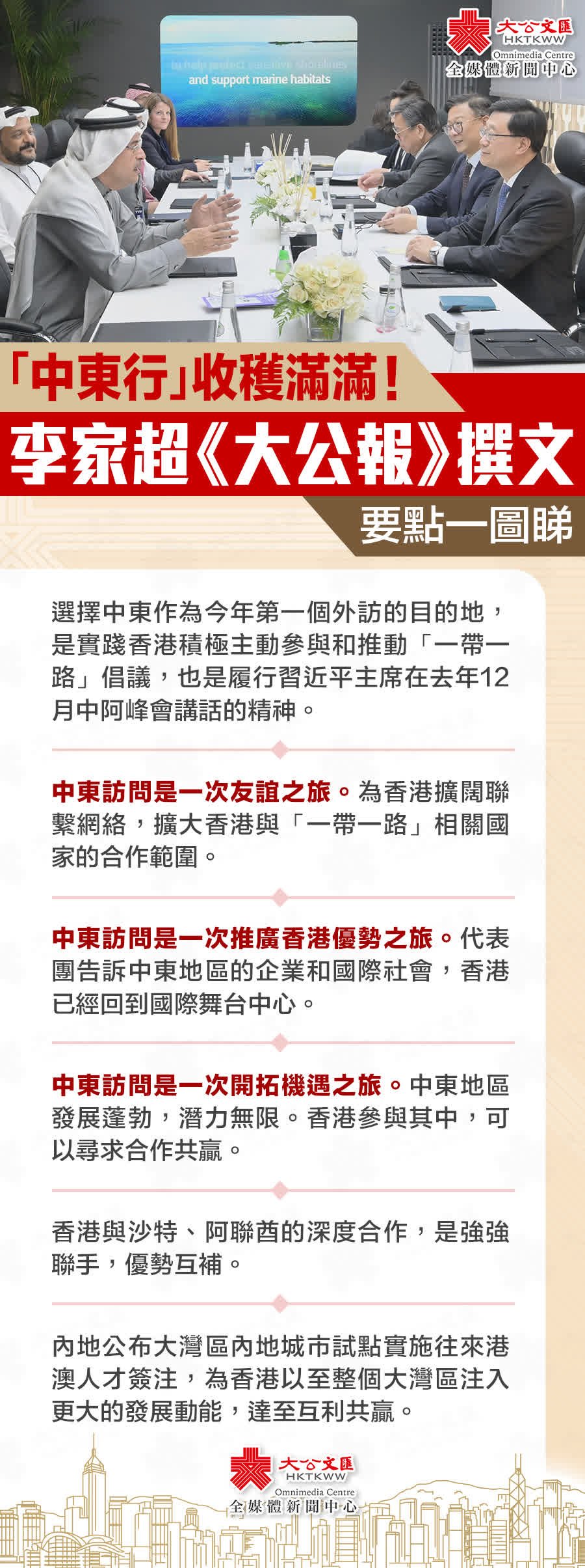 行政長官李家超率領香港特區代表團訪問中東,返抵香港後,昨天為《大公報》獨家撰文,題為《中東之行展現香港積極實踐在「一帶一路」下的角色》。他在文章中表示,隨着香港與內地全面通關,並對海外全面開放,香港的經濟動力及活力正在增速,特區政府抓緊時機外訪,說好香港故事,開拓發展機遇。香港在全面復常的快車道上昂首向前,勢不可擋。