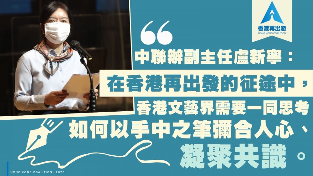 盧新寧又表示,國安法落地實施,讓香港迎來由亂到治的轉折,但平息動盪帶來的社會焦慮尚需假以時日,治癒撕裂帶來的人心創傷不會一蹴而就。她續稱,在香港再出發的征途中,香港文藝界需要一同思考如何以手中之筆彌合人心、凝聚共識,以真善美賦予這座城市活力與希望,重建家國認同,推動人心回歸,再造香港精神。