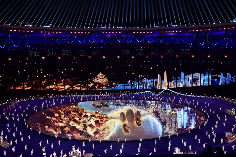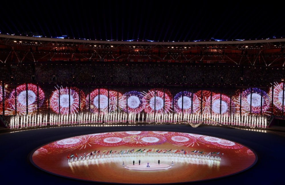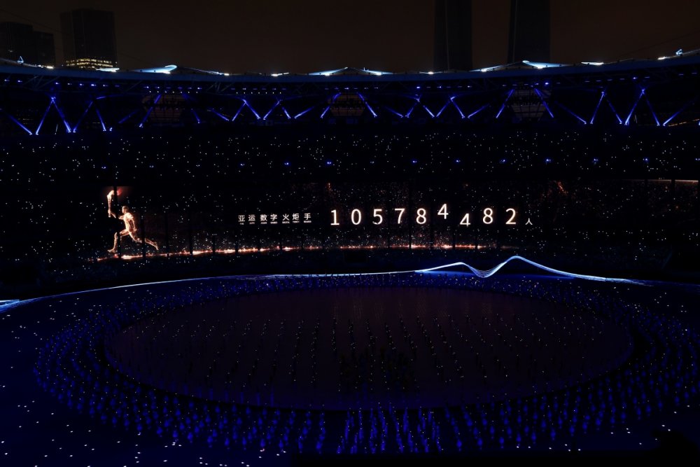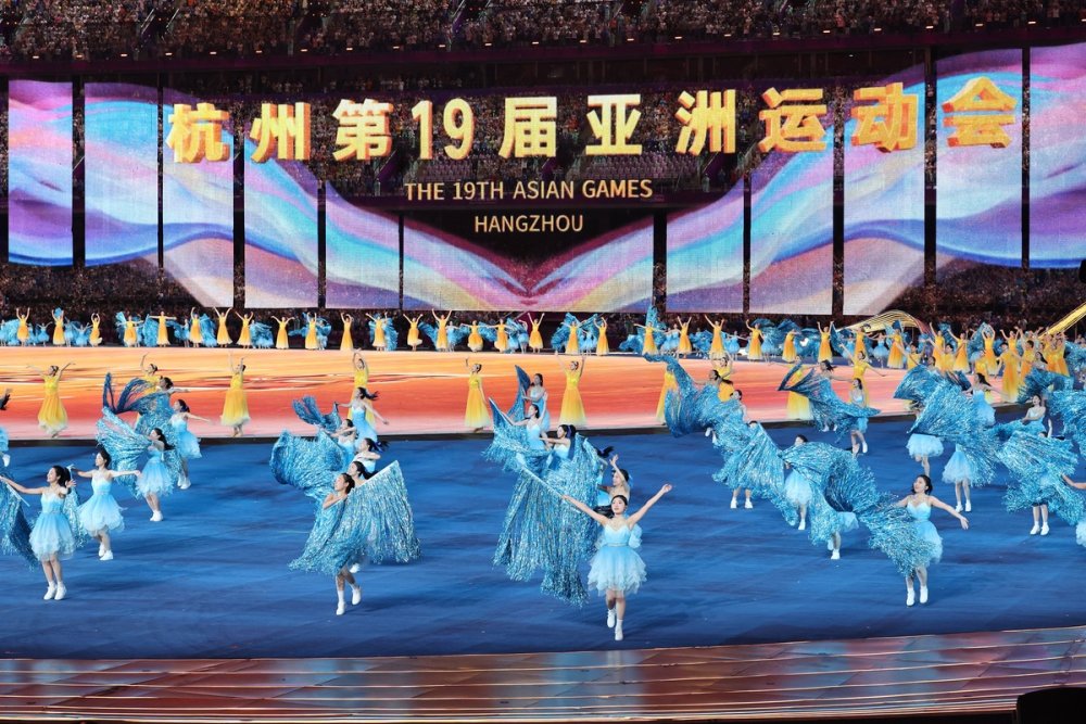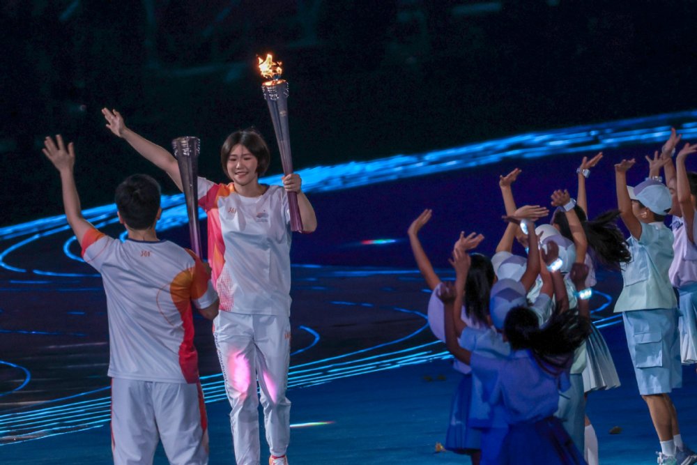 The national flag of the People's Republic of China is raised at the 19th Asian Games opening ceremony in Hangzhou on Saturday. [Photo/Xinhua]Photo taken on Sept 23 is the performance of the 19th Asian Games opening ceremony in Hangzhou on Saturday. [Photo/Xinhua]Artists perform during the opening ceremony of the 19th Asian Games in Hangzhou, East China's Zhejiang province on Saturday. [Photo by Feng Yongbin/China Daily]Artists perform during the opening ceremony of the 19th Asian Games in Hangzhou, East China's Zhejiang province on Saturday. [Photo/Xinhua]Photo taken on Sept 23 is the Hangzhou Olympic Sports Centre Stadium. [Photo/Xinhua]Photo taken on Sept 23 is the Hangzhou Olympic Sports Centre Stadium. [Photo/Xinhua]Photo taken on Sept 23 is the Hangzhou Olympic Sports Centre Stadium. [Photo/Xinhua]Photo taken on Sept 23 is the Hangzhou Olympic Sports Centre Stadium. [Photo/Xinhua]Torchbearers Xu Mengtao (right) and Fan Zhendong participate in the torch relay at the 19th Asian Games opening ceremony in Hangzhou on Sept 23, 2023. [Photo by Zhang Wei/China Daily]Torchbearers Ye Shiwen (right) and Fan Zhendong participate in the torch relay at the 19th Asian Games opening ceremony in Hangzhou on Sept 23, 2023. [Photo by Zhuang Zhenbang/China Daily]A digital torchbearer plays a role in igniting the Asian Games cauldron at the 19th Asian Games opening ceremony in Hangzhou on Sept 23, 2023. [Photo by Wei Xiaohao/China Daily]The final torchbearers Wang Shun and the digital torchbearer light the main torch at the 19th Asian Games opening ceremony in Hangzhou on Sept 23, 2023. [Photo by Gao Erqiang/China Daily]Artists perform during the 19th Asian Games opening ceremony in Hangzhou on Sept 23, 2023. [Photo by Zhuang Zhenbang/China Daily]Artists perform during the 19th Asian Games opening ceremony in Hangzhou on Sept 23, 2023. [Photo by Wei Xiaohao/China Daily]Artists perform during the 19th Asian Games opening ceremony in Hangzhou on Sept 23, 2023. [Photo by Wei Xiaohao/China Daily]Electronic fireworks light up the 19th Asian Games opening ceremony in Hangzhou on Sept 23, 2023. [Photo by Wei Xiaohao/China Daily]
