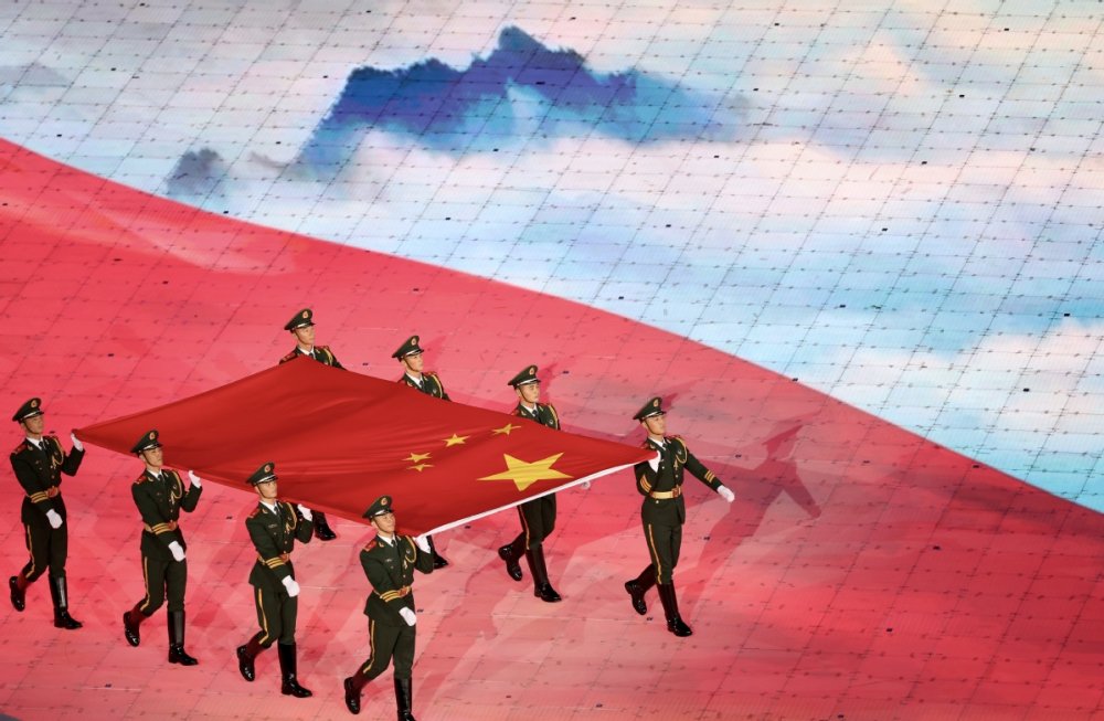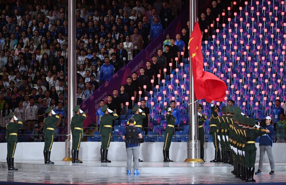 The national flag of the People's Republic of China is raised at the 19th Asian Games opening ceremony in Hangzhou on Saturday. [Photo/Xinhua]