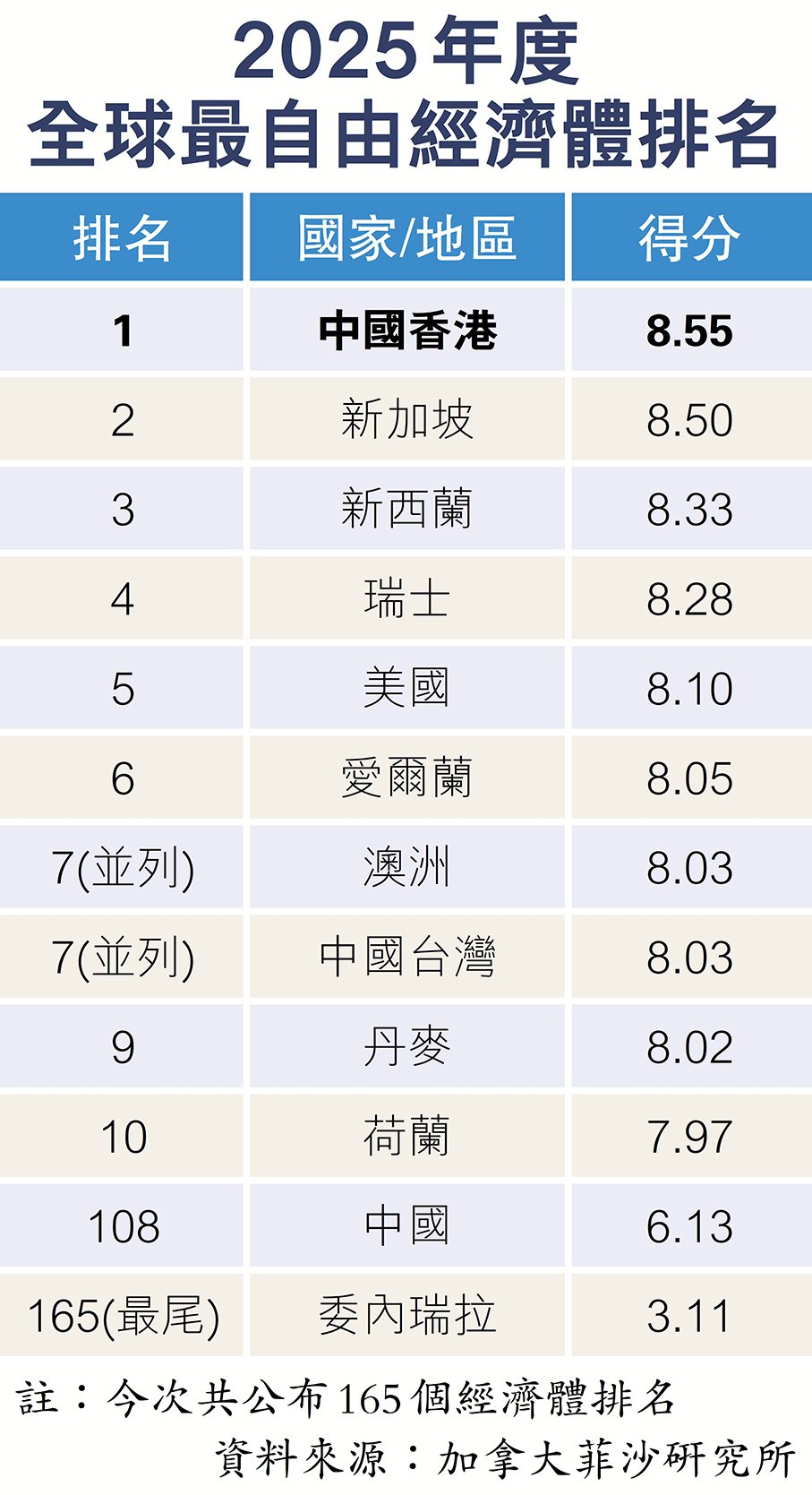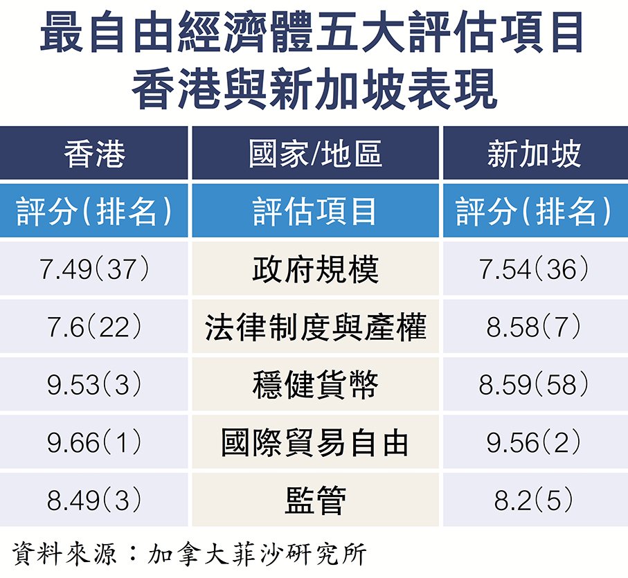 加拿大菲沙研究所昨發布《世界經濟自由度2025年度報告》,報告所列165個經濟體中,香港以整體評分8.55分繼續獲評為全球最自由經濟體。在五大分項評估中,香港在「國際貿易自由」蟬聯首位,在「穩健貨幣」及「監管」的排名亦高踞全球第三位。而在由英國Z/Yen集團與中國(深圳)綜合開發研究院編制的《全球金融中心指數》排名榜中,香港以764分的總體得分,與排首兩位的紐約及倫敦得分差距進一步收窄至僅2分和1分,繼續位列全球第三。