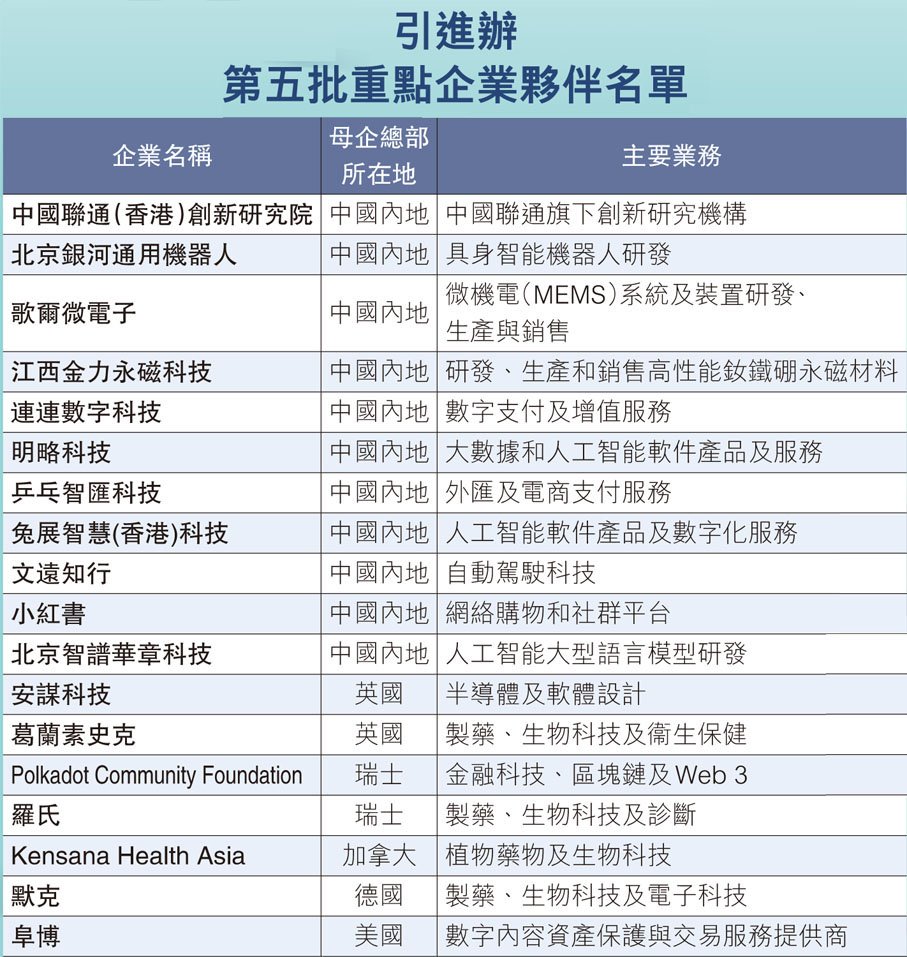 最新引進的第五批重點企業,包括內地互聯網企業小紅書、英國藥企葛蘭素史克(GSK)、內地自動駕駛企業文遠知行及美國數字知識產權企業阜博集團等。任景信指有三點值得關注。首先,近四成重點企業來自海外,外資佔比較以往有很大提升,反映香港作為國際大都會的吸引力持續增強,深受全球創科企業青睞。第二,首次引進文化創意科技領域企業,為香港帶來新產業發展。