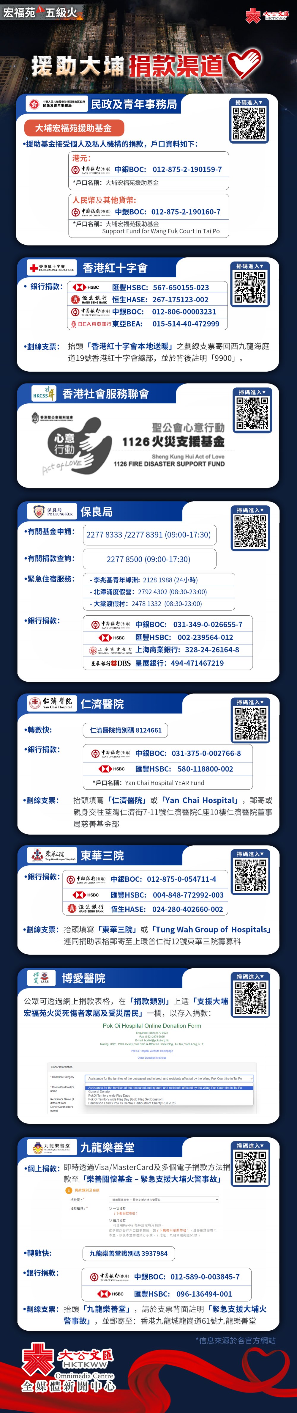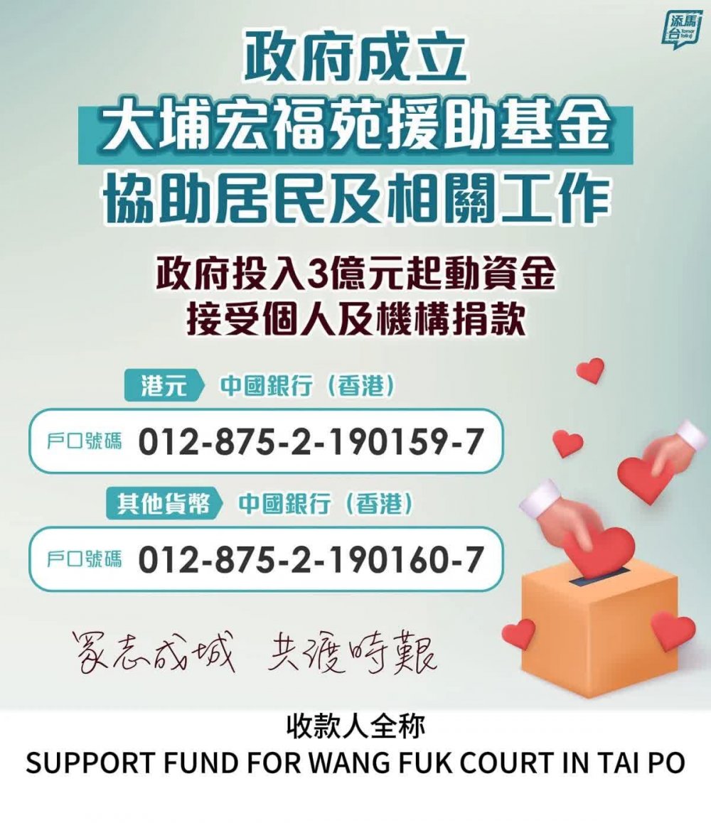 中國銀行(香港)戶口號碼012-875-2-190160-7(戶口名稱:大埔宏福苑援助基金)。