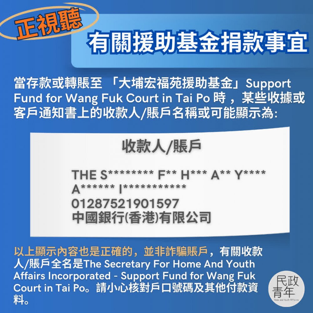 民青局收到不少查詢,有些熱心人捐款時於網上捐款時會看到戶口名稱為「The S** H* Y* A* I*」或者「T* S** H* Y* A* I**」,與基金的英文名「Support Fund for Wang Fuk Court in Tai Po」不一致,擔心是詐騙賬號。其實,基金戶口全寫為「The Secretary for Home And Youth Affairs Incorporated - Support Fund for Wang Fuk Court in Tai Po」。 因此所顯示的內容是正確的。