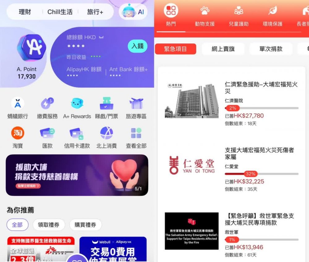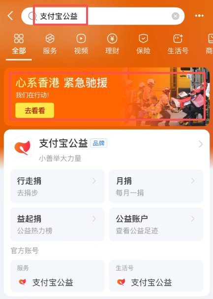 AlipayHK首頁開設專項捐助通道,方便香港市民參與慈善機構的相關救援項目。