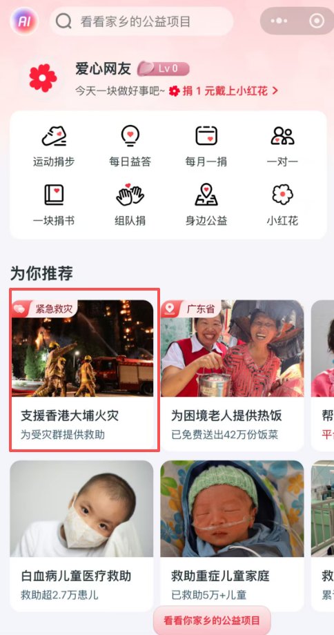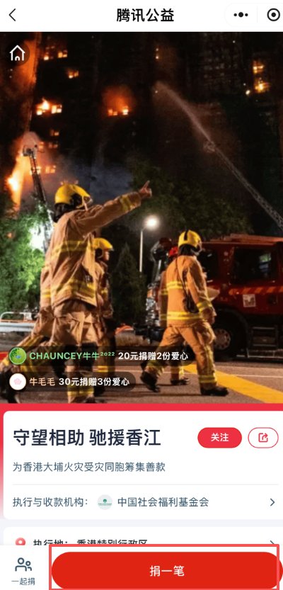 在微信搜索「騰訊公益」,進入小程序,點擊「支援香港大埔火災」欄目,選擇「捐一筆」進入捐款頁面↓