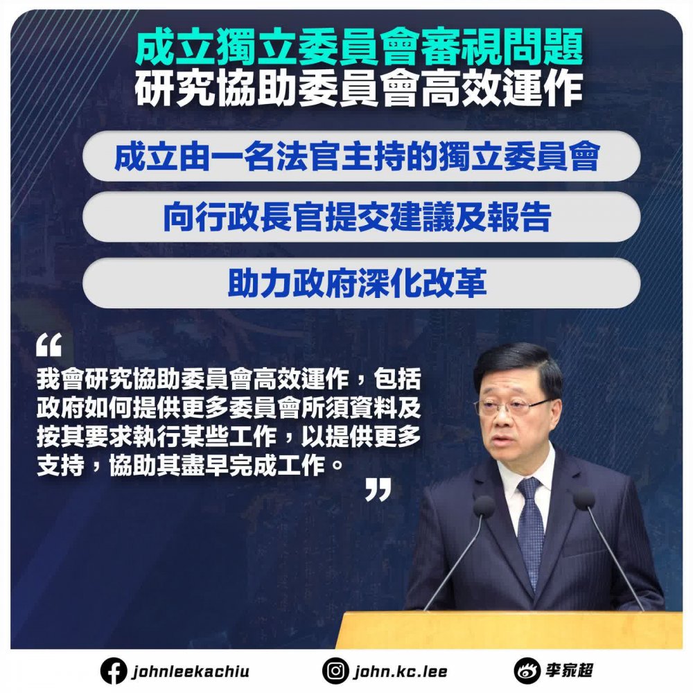 李家超指出,他會成立一個由法官主持的獨立委員會,審視事故起火和迅速蔓延的原因及相關問題。他會聯繫司法機構,邀請一名法官主持委員會的工作,研究詳細的工作範圍。同時,研究協助委員會高效運作,包括政府如何提供更多委員會所須資料及按其要求執行某些工作,以提供更多支持,協助其盡早完成工作,向他提交建議和報告,助力政府深化改革。
