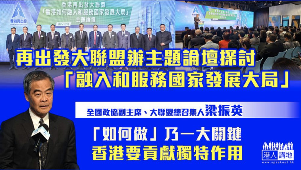 由香港再出發大聯盟主辦的「香港如何融入和服務國家發展大局」主題論壇,今日(18日)下午舉行。全國政協副主席、香港再出發大聯盟總召集人梁振英出席並作開幕致辭及主持小組討論,強調國家經常對香港提出「國家所需、香港所長」,就是要香港貢獻自己獨特作用、發揮獨特優勢。
