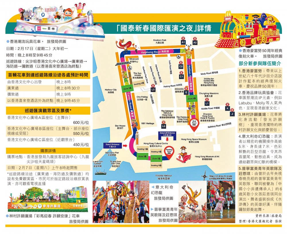 農曆新年即將來臨,當中的重頭戲「國泰新春國際匯演之夜」將於大年初一(下月17日)上演。今年有近60隊來自香港、內地及海外的花車及隊伍參與表演,更有不少新元素和首次參與隊伍,包括香港麥當勞、林村許願樹、曾在央視春晚演出的普寧富美青年英歌隊和6歲英歌小女孩莊恩琪等,首次在這活動亮相。旅發局預計屆時有10萬人到場觀賞,其中一半是旅客。