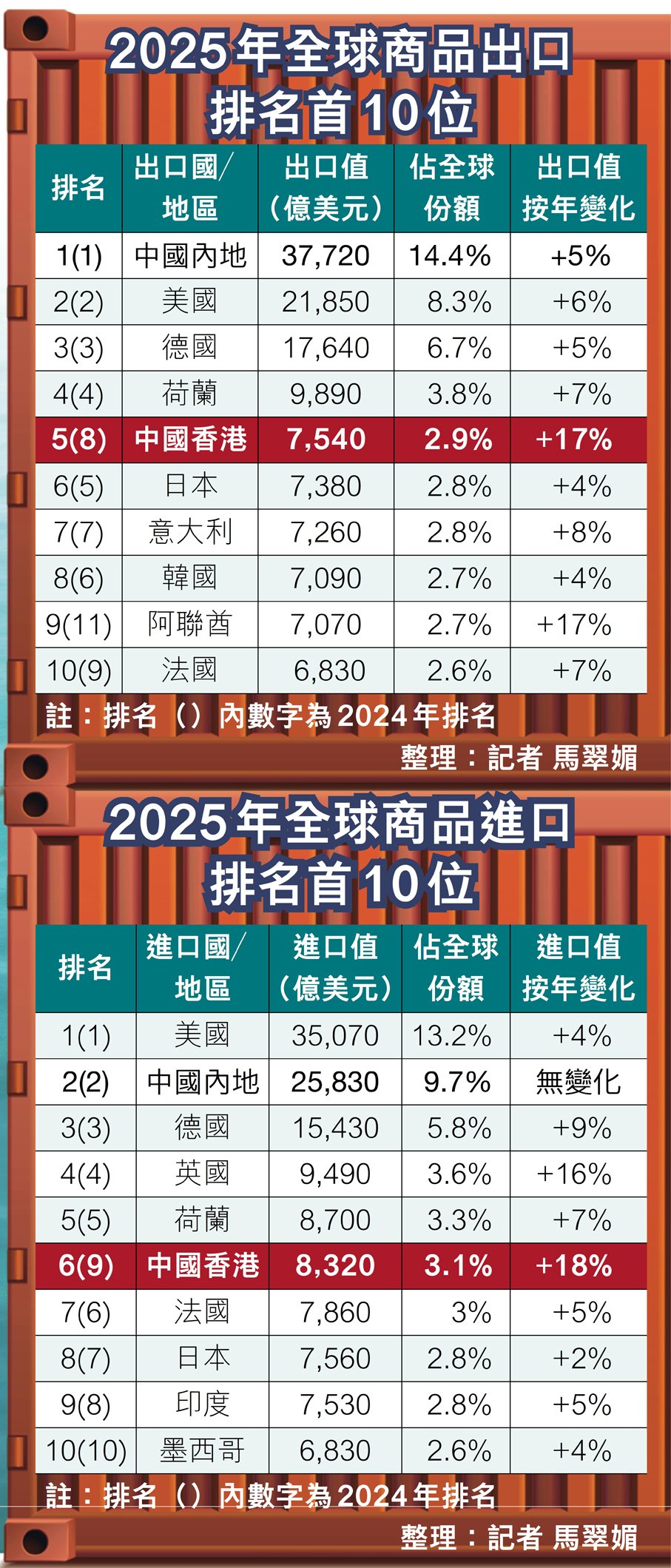 報告指出,2025年全球商品貿易量增長4.6%,較2024年的2.7%有所加快,但預計2026年將放緩至1.9%。若將香港與其他主要貿易經濟體比較,其進出口增長率均屬前列。以2025年為例,美國出口增長6%、進口增長4%;德國出口增長5%、進口增長9%;日本出口增長4%、進口增長2%。相比之下,香港的雙位數增長顯得更為突出。